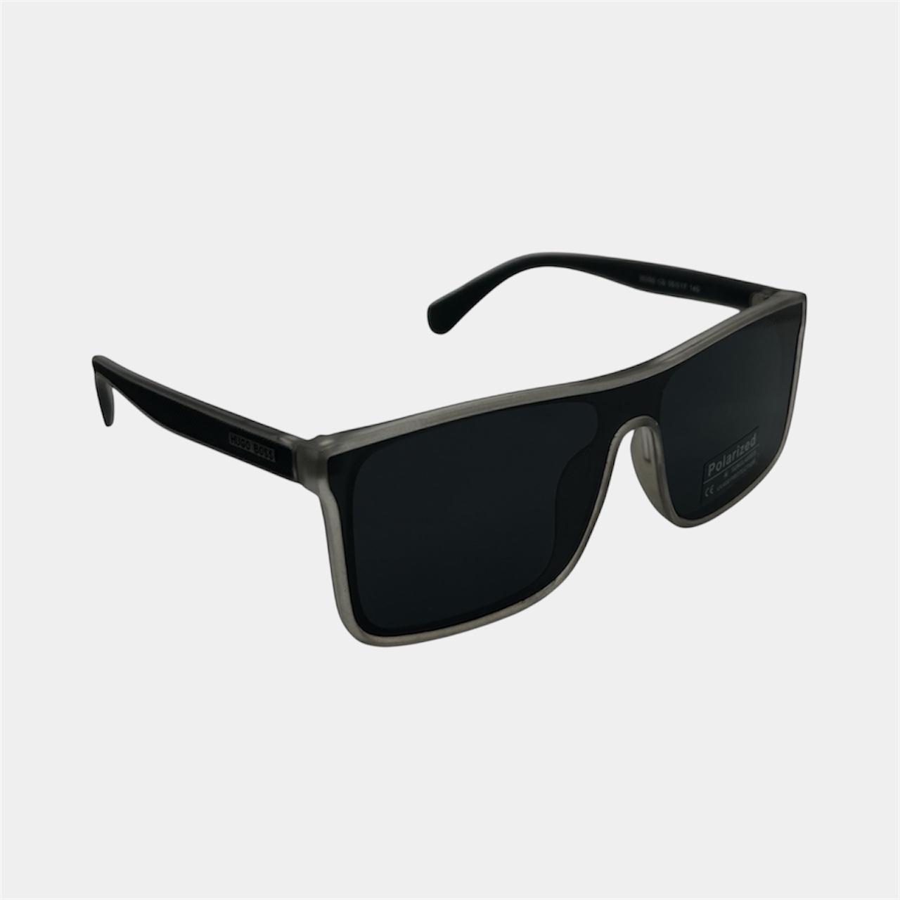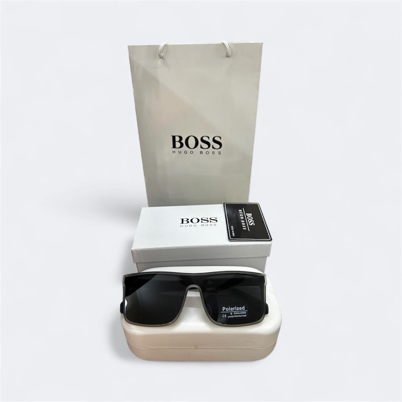 يتميز التصميم بإطار مربع (Square) جريء، مع واجهة أمامية بلون رمادي شفاف (Crystal Grey) تمنحها طابعاً عصرياً فريداً، وتتناسق بشكل أنيق مع الأذرع السوداء الكلاسيكية التي تحمل شعار BOSS بوضوح.